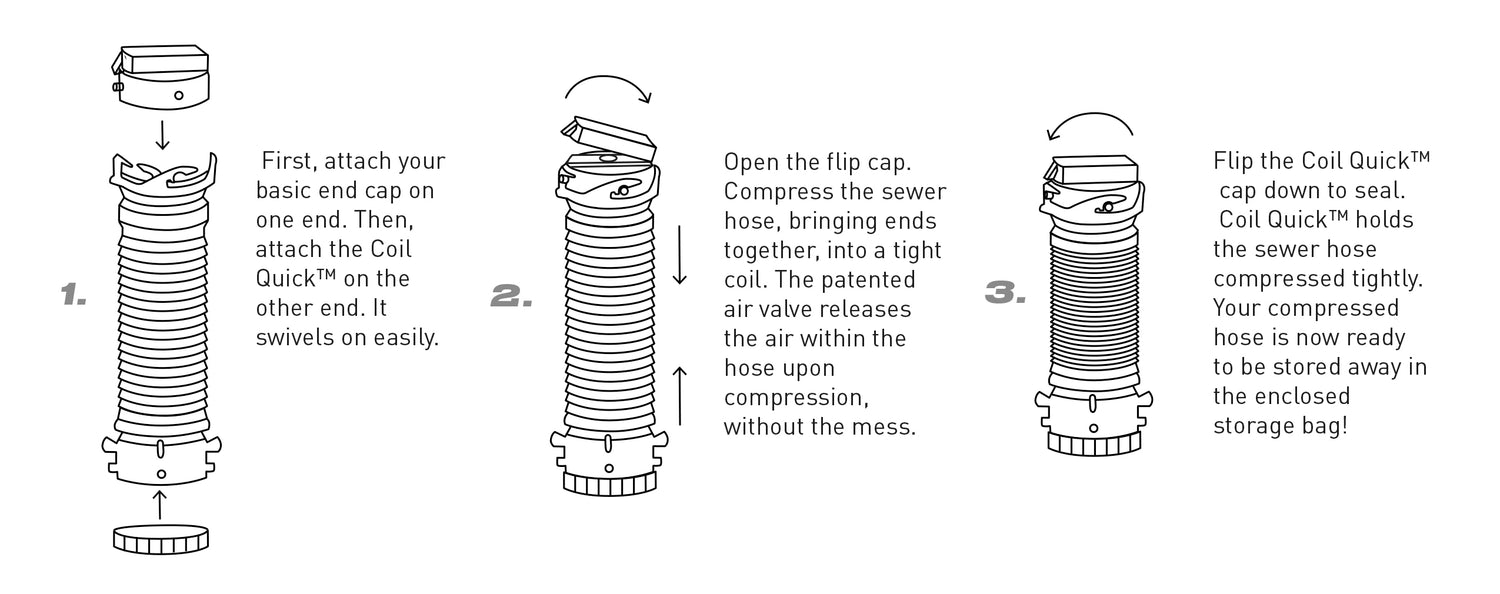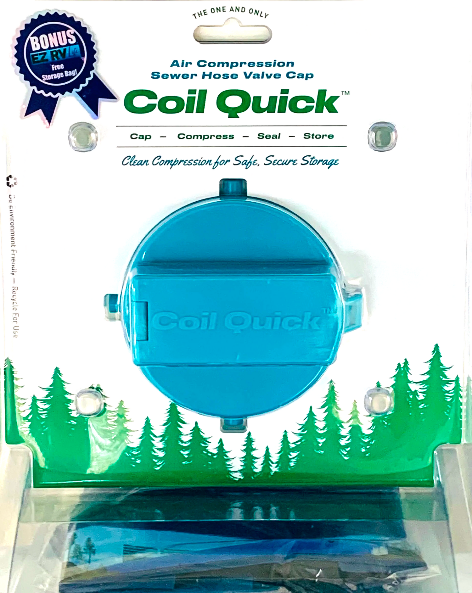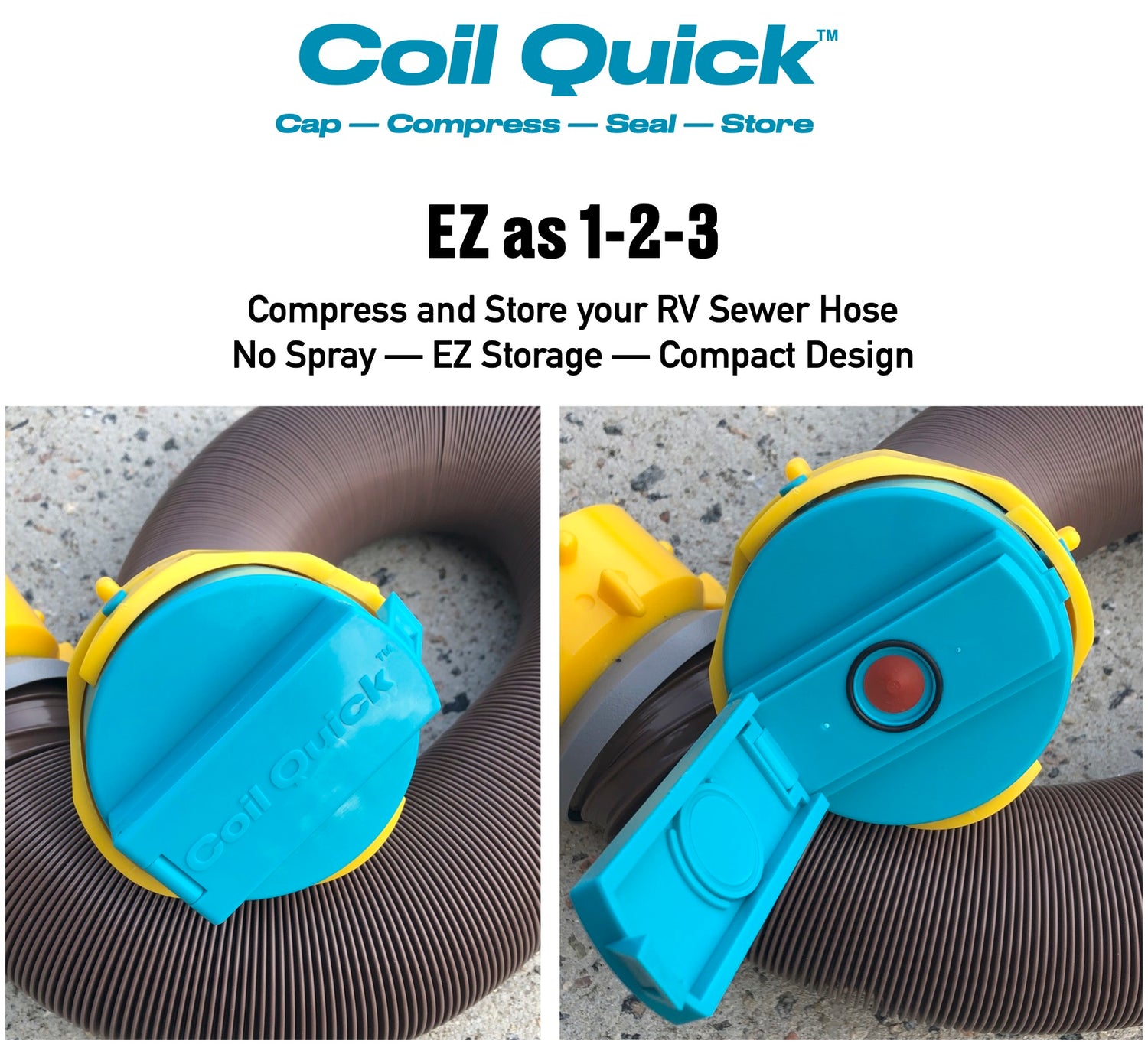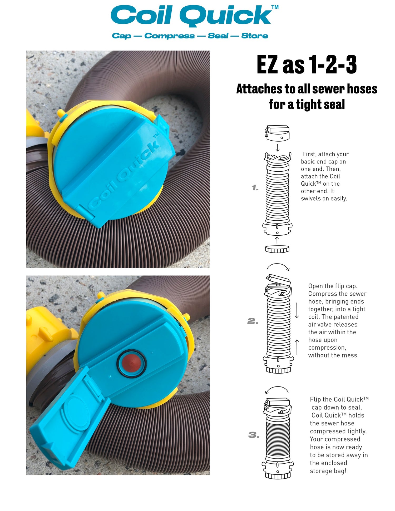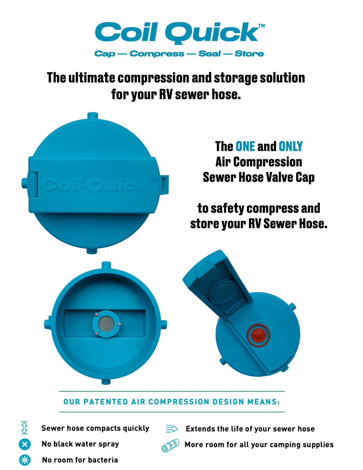 Our Coil Quick™️ valve cap, with its patented one-way valve and manual compression and seal feature, makes compression and storage of your sewer hose clean, fast, and EZ - you'll be back on the road in minutes with Coil Quick™️!