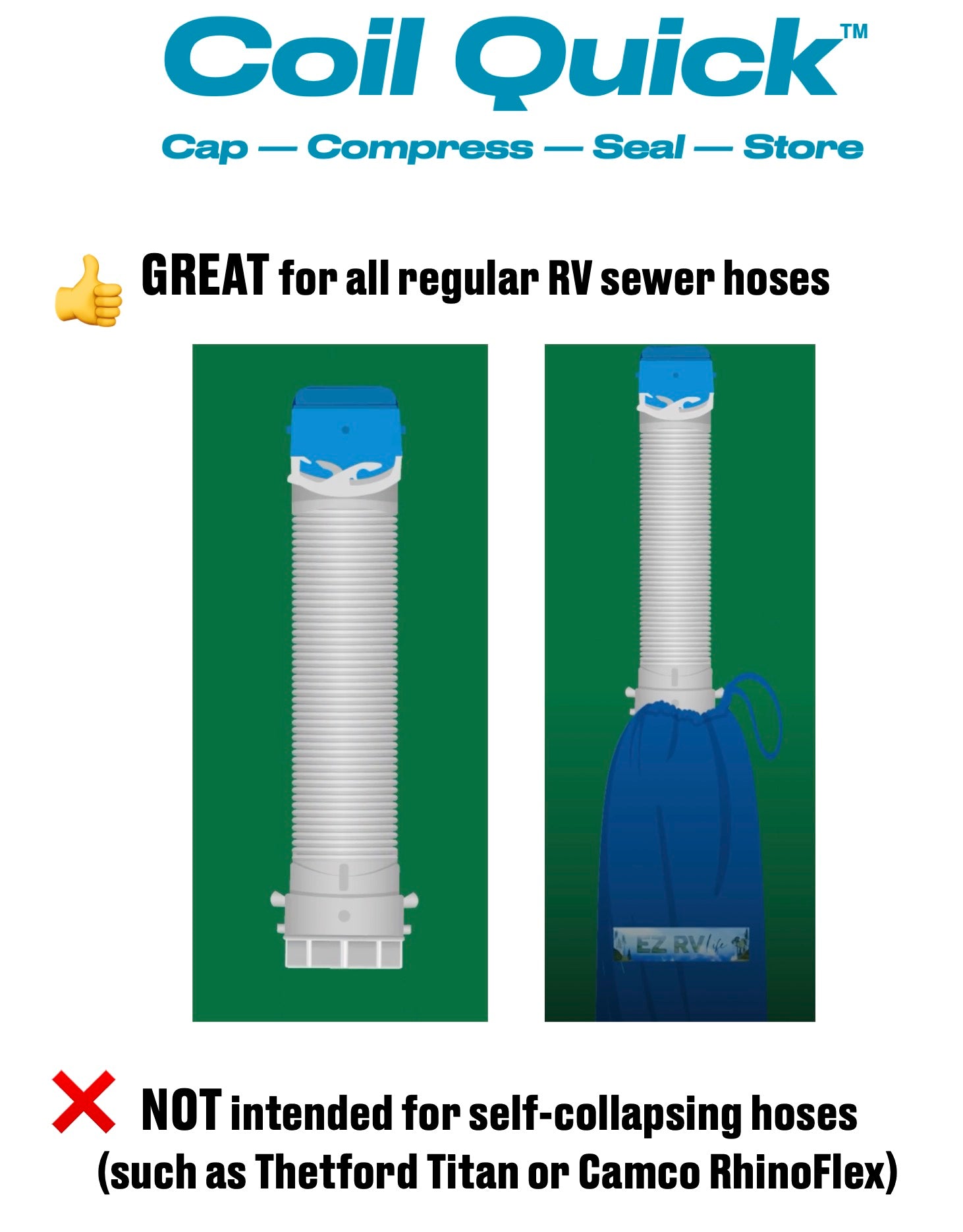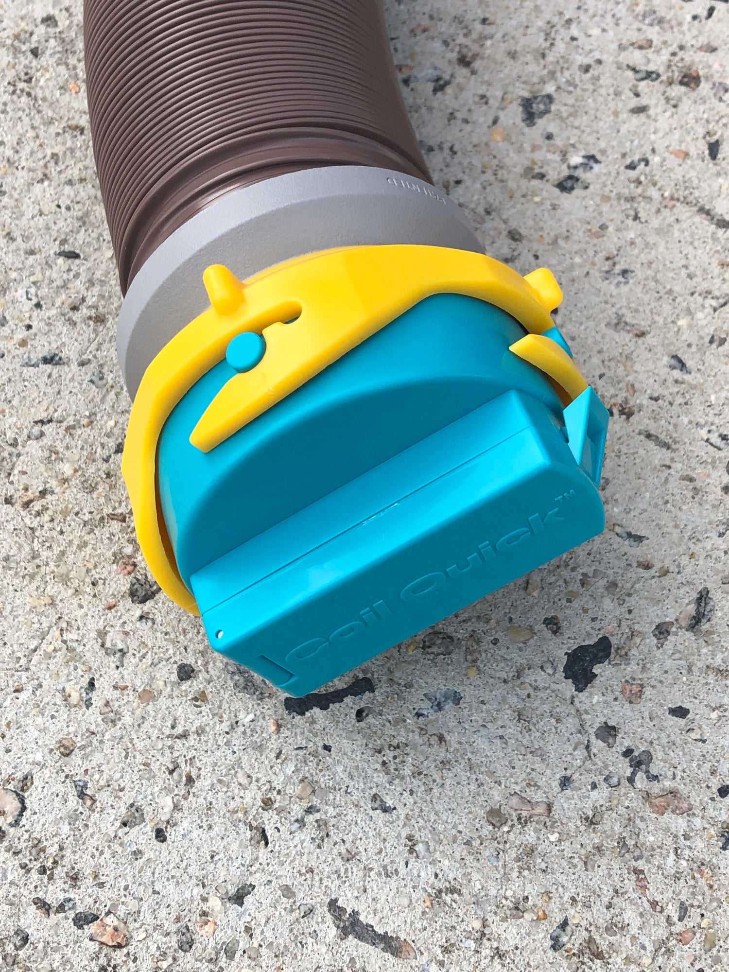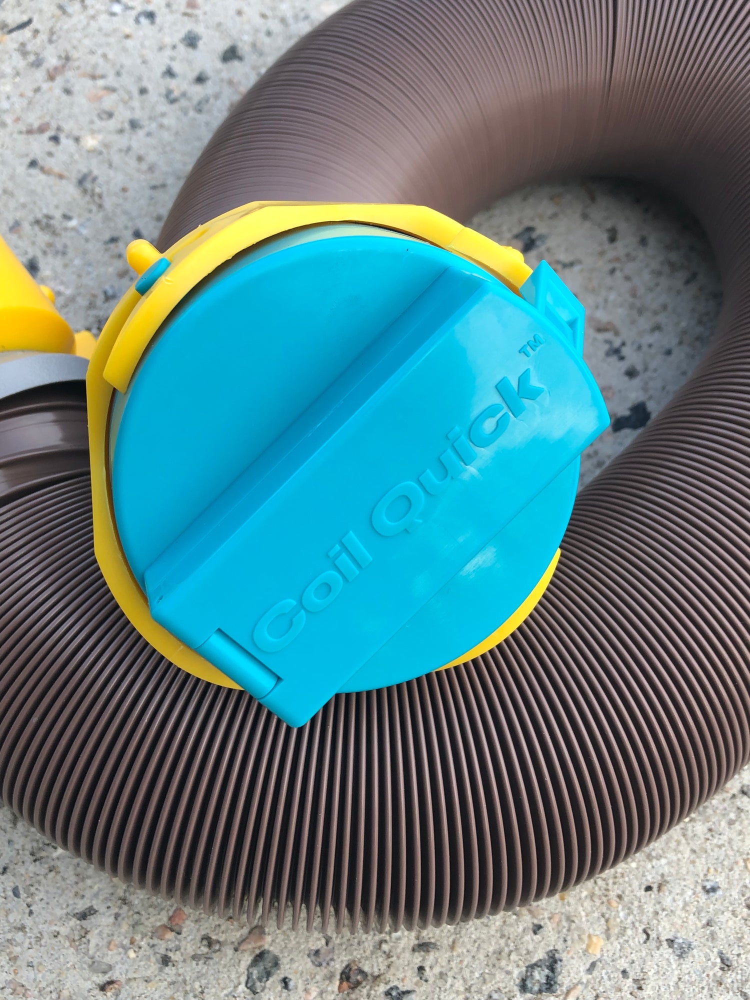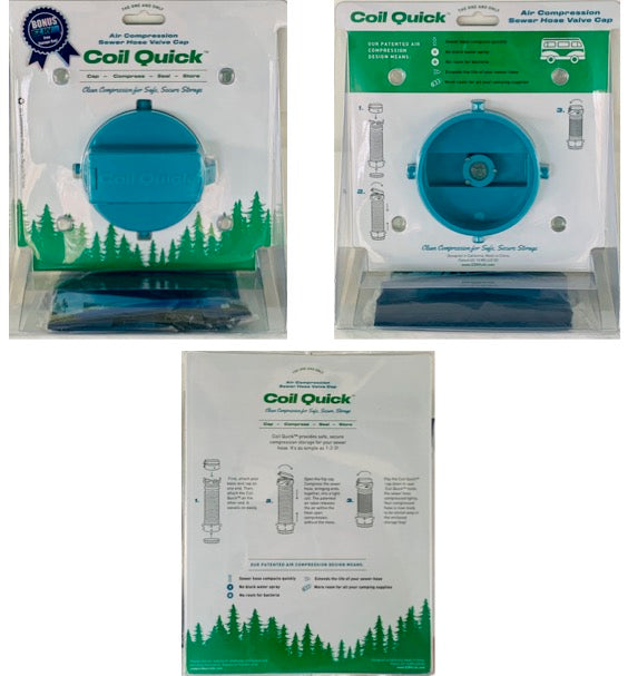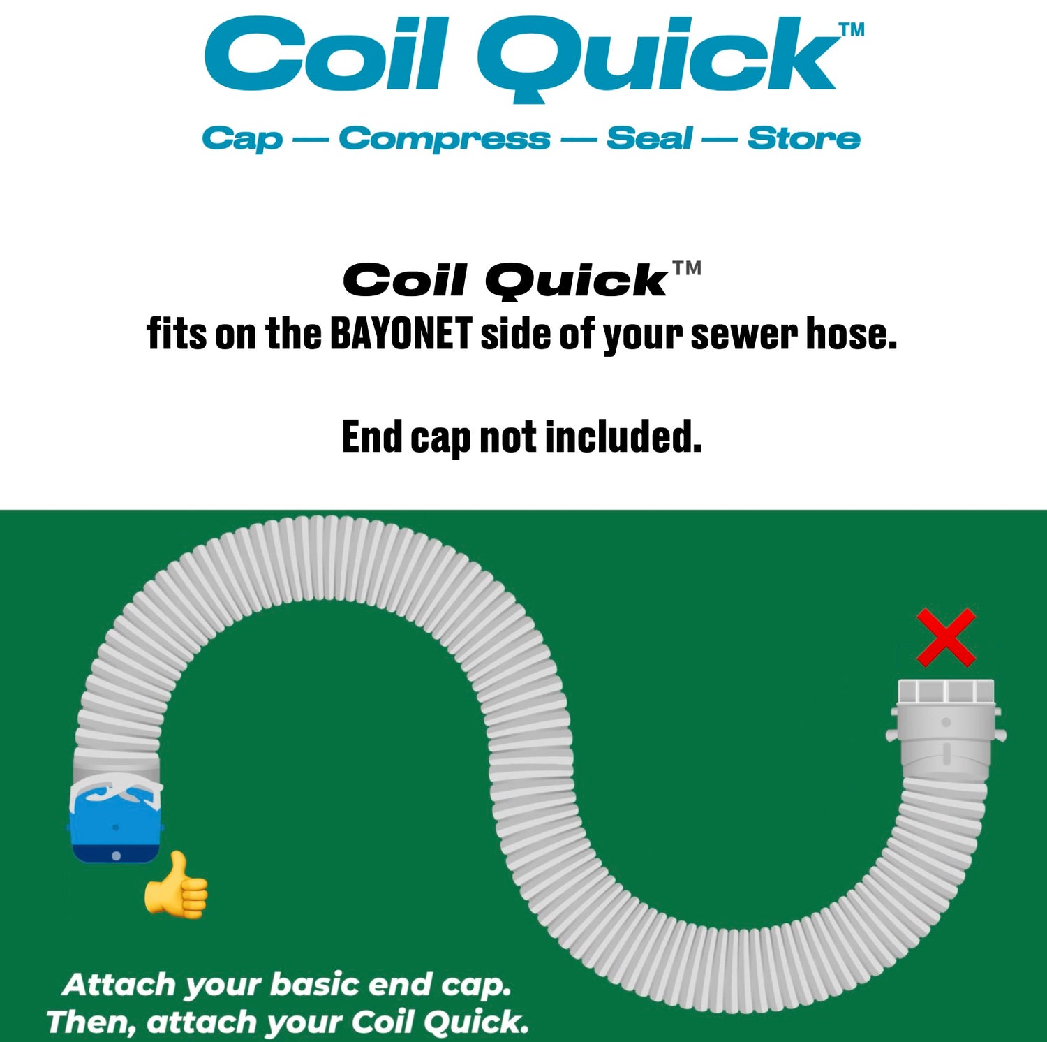 Our Coil Quick™️ valve cap, with its patented one-way valve and manual compression and seal feature, makes compression and storage of your sewer hose clean, fast, and EZ - you'll be back on the road in minutes with Coil Quick™️!