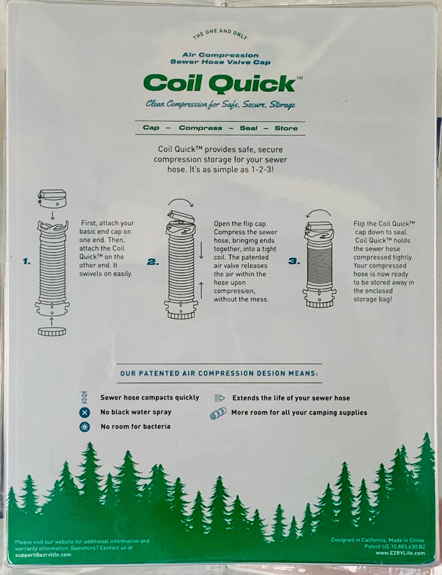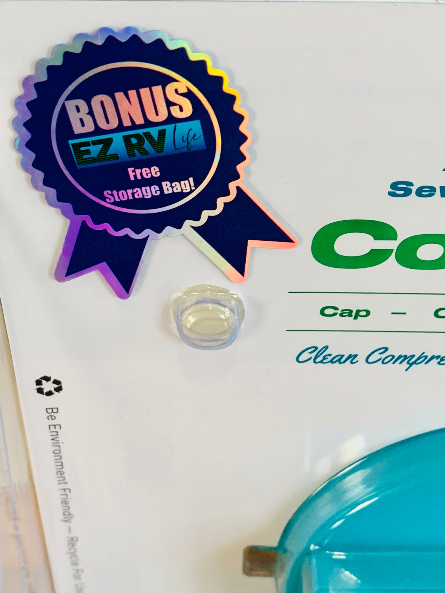 Coil Quick™️ comes with 1 air compression sewer hose valve cap and 1 EZ RV LIFE storage bag. End cap is not included.